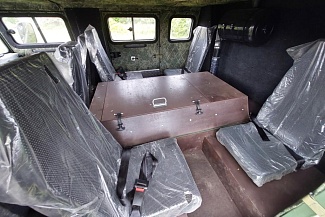 Объёмный салон позволяет с комфортом разместить 7 человек (включая водителя), или различное технологическое оборудование до 2180 кг. Переднее сиденье пассажира и сиденье водителя оснащены трехточечными ремнями безопасности. В кабине штатный жидкостной отопитель. По заказу устанавливаем автономный воздушный отопитель.