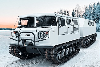Двухзвенный снегоболотоход СТМ-70872 на большие расстояния может транспортироваться в кузове автомобиля типа КАМАЗ с полуприцепом, а также авиа или железнодорожным транспортом.