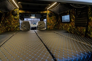 В салоне штатный отопитель от системы охлаждения двигателя, как доп. опция устанавливается автономный воздушный отопитель. Пассажирские места в салоне легко трансформируются в большое ровное спальное место или постоянное П-образное спальные места. Предусмотрены удобные поручни для пассажиров, полки, USB розетки. Светодиодное освещение салона. Дополнительные опции по желанию заказчика.