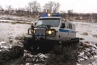 Плавающий 8-и местный вездеход. ДВС: CUMMINS ISF 2.8 / Турбодизель / 148 л.с., КПП: 5-и ступенчатая, механическая, доп. передача: двухступенчатая, механическая, Гусеницы стальные ОШ