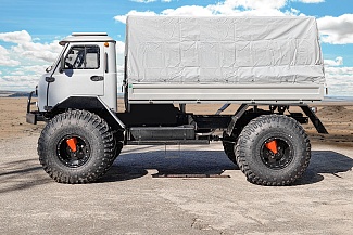 Вездеход на шинах низкого давления СТМ-39934 (4х4) изготовляется с кузовом УАЗ-3303 Бортовой (доработанный).