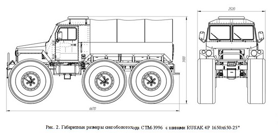 Шины низкого давления RUSAK 4P 1650 х 650 – 25’’ (бескамерная)имеют 4 слоя корда, несущая способность 1245 кг на колесо. За счёт увеличения толщины шины обладают большей устойчивостью к проколам и порезам. Они разработаны для перевозки тяжёлых грузов в условиях бездорожья и по слабонесущим грунтам.На данном вездеходе колёса сверхнизкого давления взаимозаменяемые с колёсами ГАЗ-33081 (ГАЗ-66). Категория прав А III.
