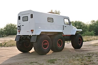 - Оригинальные мосты, усиленные, с бортовыми редукторами, полуоси полностью разгружены. («Большое Колесо»). Клиренс 630 мм, грузоподъёмность 600 кг. Передний ведущий мост - с управляемыми колёсами, привод осуществляется через карданную передачу. Передний и средний ведущие мосты - с дифференциальной связью, задний ведущий мост - подключаемый, без дифференциальной связи, с вентилируемыми дисковыми тормозными механизмами. Шины двухслойные 1300х600-21" Категория прав А II (внедорожные автотранспортные средства)