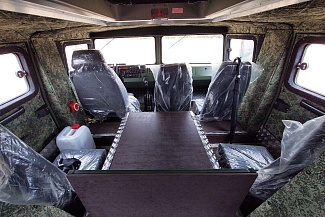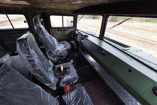 Объёмный салон позволяет с комфортом разместить 15 человек (включая водителя), или различное технологическое оборудование до 1980 кг. Переднее сиденье пассажира и сиденье водителя оснащены трехточечными ремнями безопасности, пассажирские сиденья салона оснащены поясными ремнями. В кабине штатный жидкостной отопитель. По заказу устанавливаем автономный воздушный отопитель.