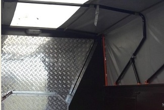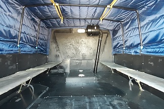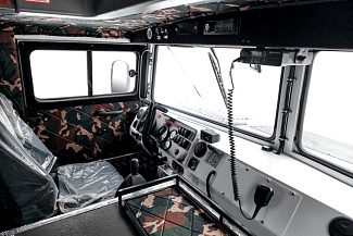 Объёмный салон позволяет с комфортом разместить 2 человек (включая водителя), или различное технологическое оборудование до 1430 кг. Переднее сиденье пассажира и сиденье водителя оснащены трехточечными ремнями безопасности. В кабине штатный жидкостной отопитель. По заказу устанавливаем автономный воздушный отопитель.