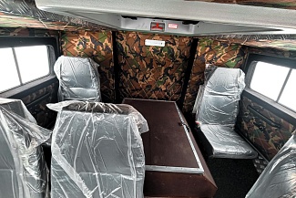 Объёмный салон позволяет с комфортом разместить 5 человек (включая водителя), или различное технологическое оборудование до 2180 кг. Переднее сиденье пассажира и сиденье водителя оснащены трехточечными ремнями безопасности. В кабине штатный жидкостной отопитель. По заказу устанавливаем автономный воздушный отопитель.