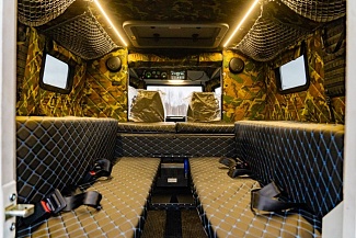 В салоне штатный отопитель от системы охлаждения двигателя, как доп. опция устанавливается автономный воздушный отопитель. Пассажирские места в салоне легко трансформируются в большое ровное спальное место или постоянное П-образное спальные места. Предусмотрены удобные поручни для пассажиров, полки, USB розетки. Светодиодное освещение салона. Дополнительные опции по желанию заказчика.