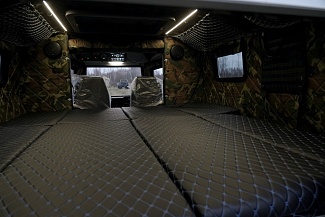 В салоне штатный отопитель от системы охлаждения двигателя, как доп. опция устанавливается автономный воздушный отопитель. Пассажирские места в салоне легко трансформируются в большое ровное спальное место или постоянное П-образное спальные места. Предусмотрены удобные поручни для пассажиров, полки, USB розетки. Светодиодное освещение салона. Дополнительные опции по желанию заказчика.