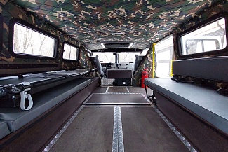 Объёмный салон позволяет с комфортом разместить 8 человек (включая водителя), или различное технологическое оборудование до 1280 кг. Переднее сиденье пассажира и сиденье водителя оснащены трехточечными ремнями безопасности, пассажирские сиденья салона оснащены поясными ремнями. В салоне штатный жидкостной отопитель. По заказу устанавливаем автономный воздушный отопитель.