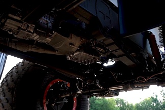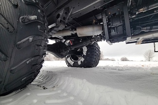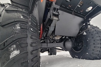 - Оригинальные мосты, усиленные, с бортовыми редукторами, полуоси полностью разгружены. («Большое Колесо»). Клиренс 630 мм, грузоподъёмность 600 кг. Передний ведущий мост - с управляемыми колёсами, привод осуществляется через карданную передачу. Передний и средний ведущие мосты - с дифференциальной связью, задний ведущий мост - подключаемый, без дифференциальной связи, с вентилируемыми дисковыми тормозными механизмами. Шины двухслойные 1300х600-21" Категория прав А II