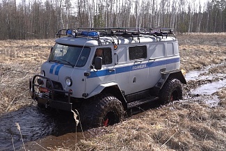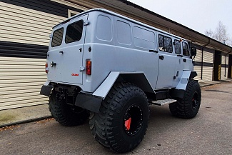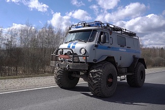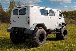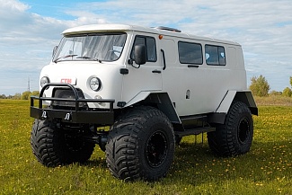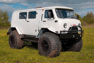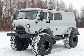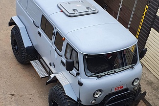 Вездеход на шинах низкого давления СТМ-39933 (4х4) изготовляется с кузовом УАЗ-220695 Автобус, простонародье «Буханка». (доработанный, удленённый).
