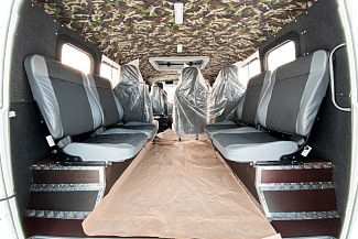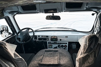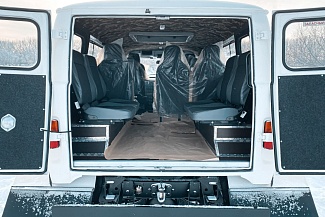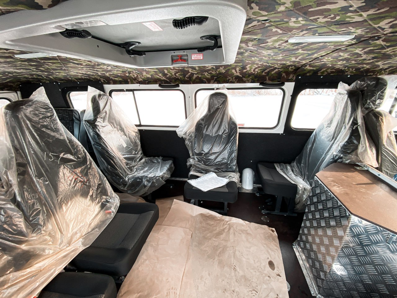 В салоне передний и задний жидкостные отопители от двигателя. Устанавливается по заказу автономный воздушный отопитель. Салон - утеплённый и позволяет с комфортом разместить 8 человек (включая водителя), или различное технологическое оборудование. Переднее сиденье пассажира и сиденье водителя оснащены трехточечными ремнями безопасности, пассажирские сиденья салона оснащены поясными ремнями. Пассажирские места в салоне легко трансформируются в спальные места. Предусмотрены удобные поручни, полки, USB розетки. В салоне Салон по желанию заказчика может быть доработан по Вашему варианту комфортабельности.
