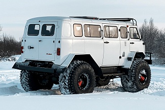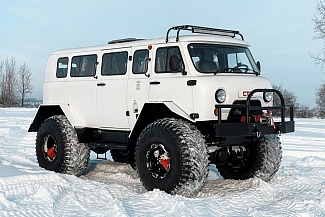 Вездеход на шинах низкого давления СТМ-39933 (4х4) изготовляется с кузовом УАЗ-220695 Автобус. (доработанный, удлиненный, утеплённый).