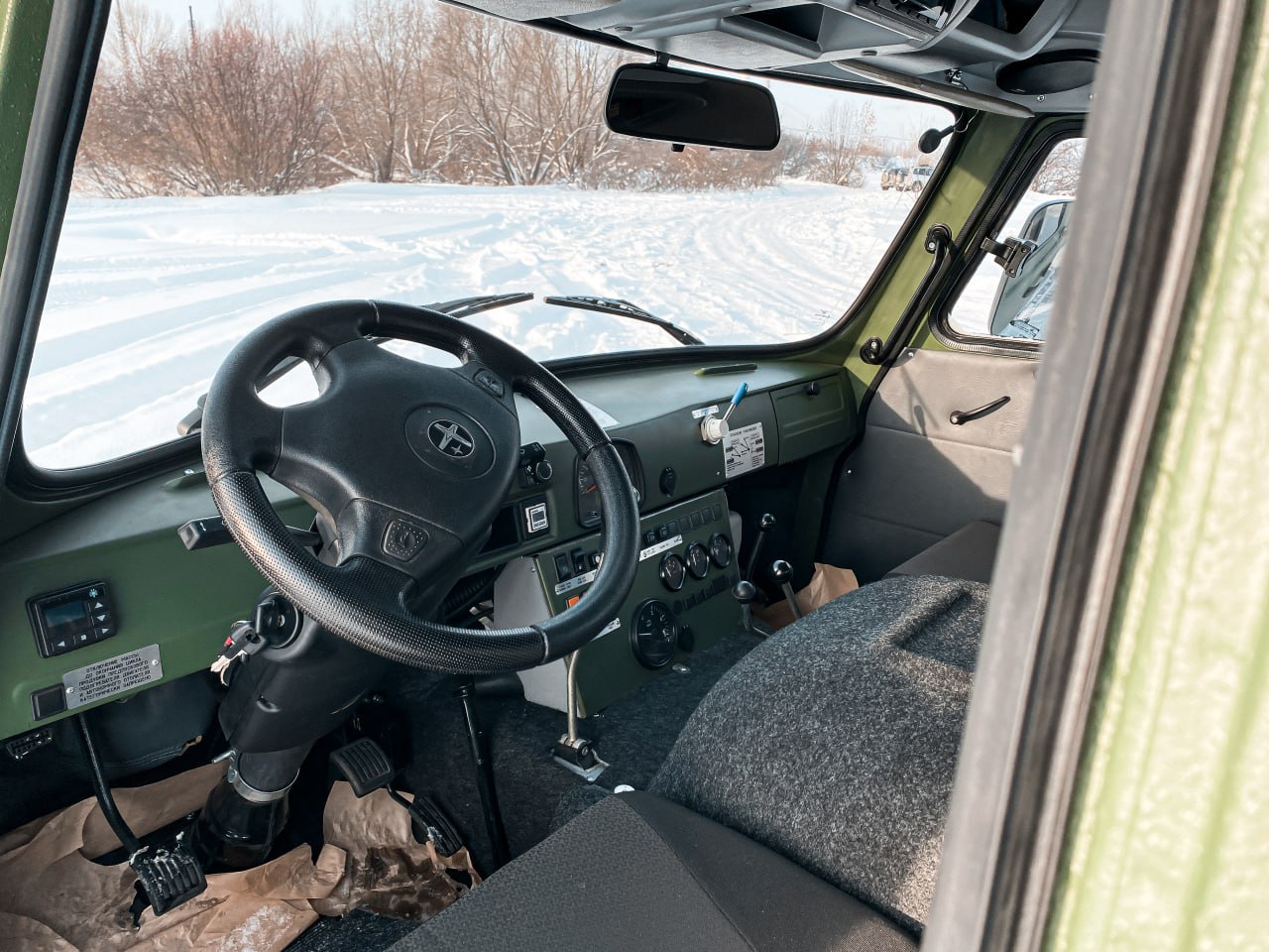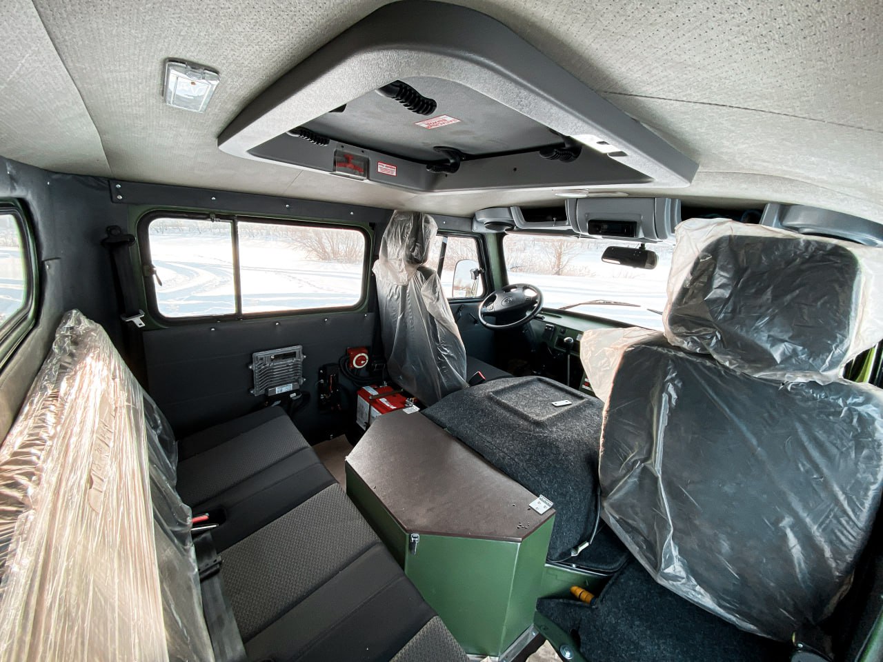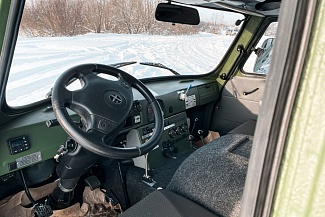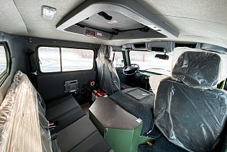 В салоне передний и задний жидкостные отопители от двигателя. Устанавливается по заказу автономный воздушный отопитель. Салон - утеплённый и позволяет с комфортом разместить 5 человек (включая водителя), или различное технологическое оборудование. Переднее сиденье пассажира и сиденье водителя оснащены трехточечными ремнями безопасности, пассажирские сиденья салона оснащены поясными ремнями. Пассажирские места в салоне легко трансформируются в спальные места. Предусмотрены удобные поручни, полки, USB розетки. Салон по желанию заказчика может быть доработан по Вашему варианту комфортабельности.